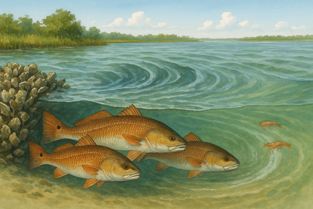 Redfish tolerate salinity swings but prefer balance. After big rains, they shift toward passes where bait rebounds first.